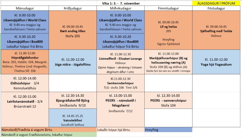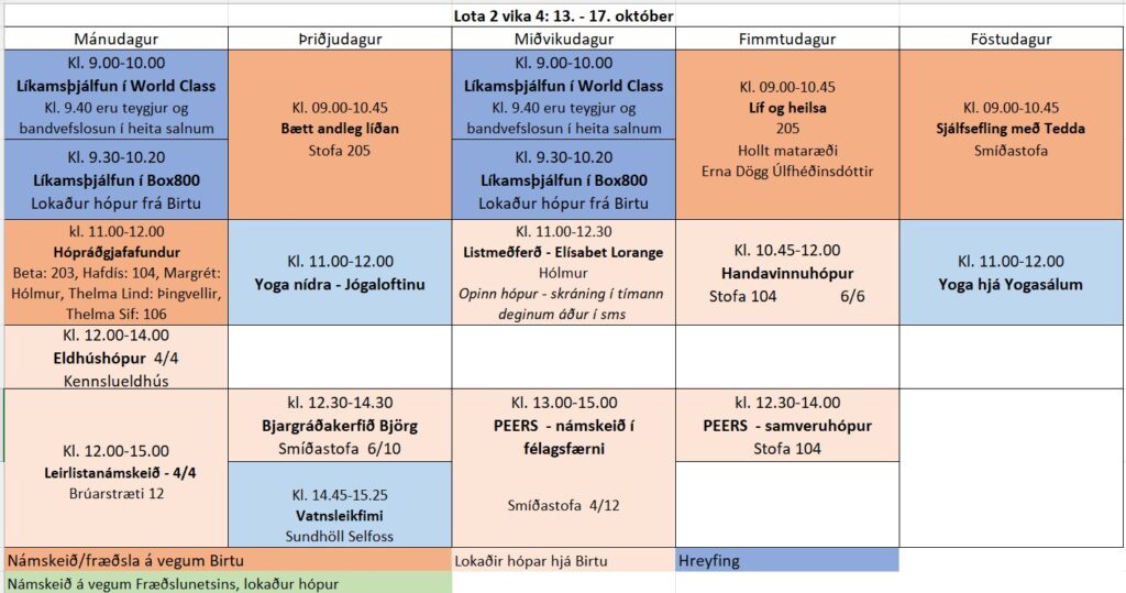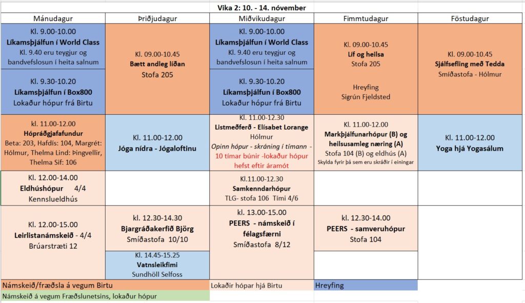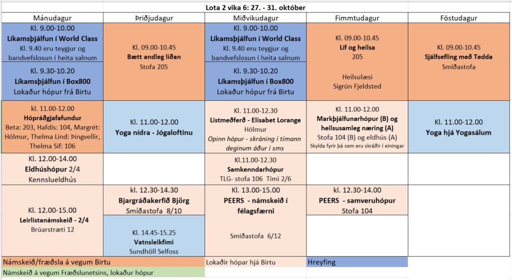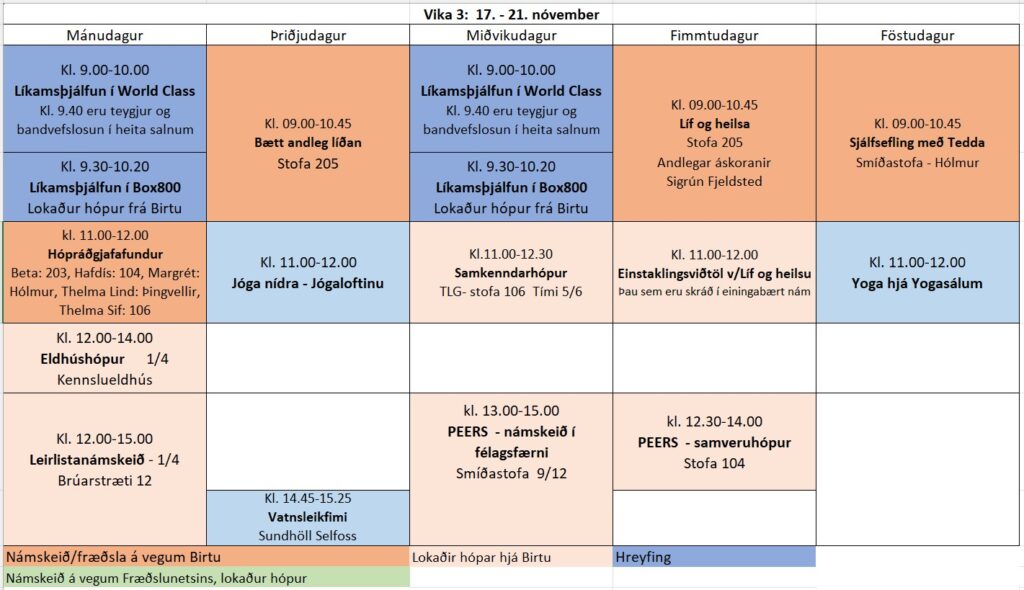 Athugið að þetta er stundataflan yfir allt sem er í boði hjá Birtu þessa vikuna. Hægt að fá einstaklingsstundatöflu með þeim námskeiðum og úrræðum sem hver og einn er í.